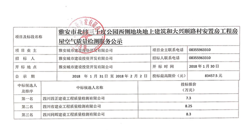 雅安市北緯三十度公園西側地塊地上建筑工程和大興順路村安置房工程房屋空氣質量檢測服務公示