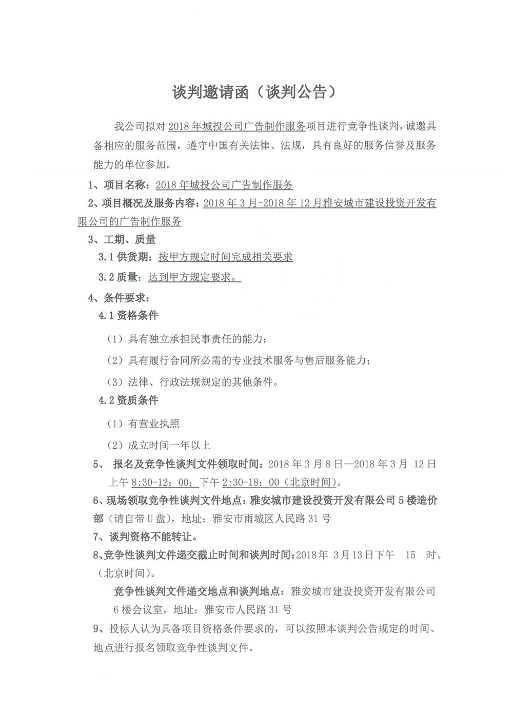 2018年城投公司廣告制作服務(wù)項目談判邀請函(談判公告)