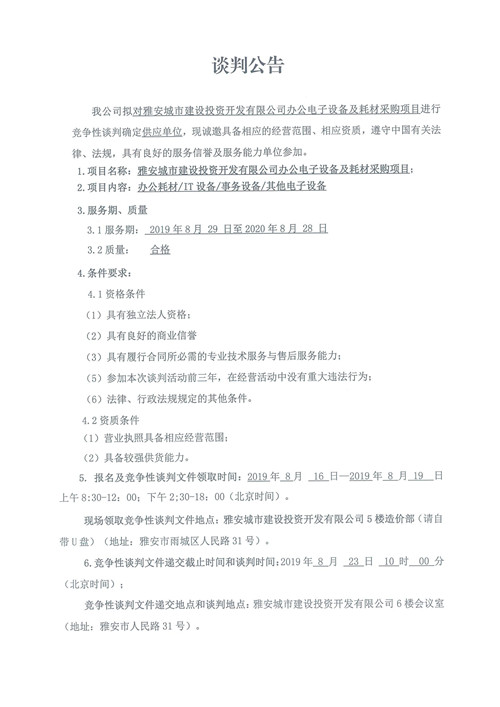 雅安城市建設(shè)投資開發(fā)有限公司辦公電子設(shè)備及耗材采購項目競爭性談判公告