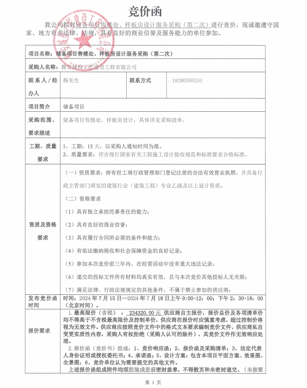 儲備項目售樓處、樣板房設計服務采購(第二次)競價公告