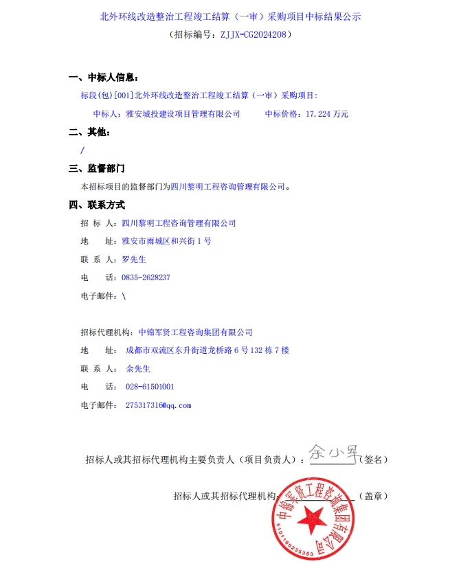 北外環(huán)線改造整治工程竣工結算(一審)采購項目中標結果公示