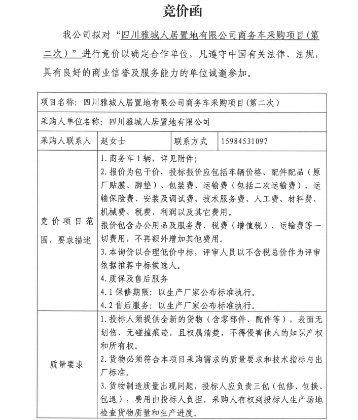 四川雅城人居置地有限公司商務(wù)車采購項(xiàng)目(第二次)競(jìng)價(jià)公告