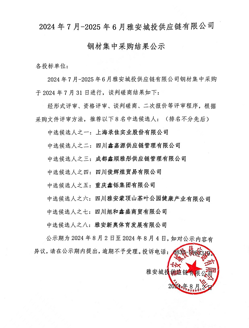 2024年7月-2025年6月雅安城投供應(yīng)鏈有限公司鋼材集中采購結(jié)果公示