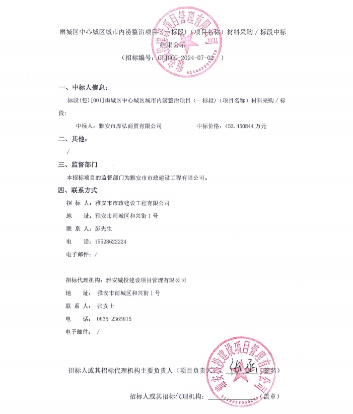 雨城區(qū)中心城區(qū)城市內(nèi)澇整治項(xiàng)目(一標(biāo)段)(項(xiàng)目名稱(chēng))材料采購(gòu)/標(biāo)段中標(biāo)結(jié)果公示
