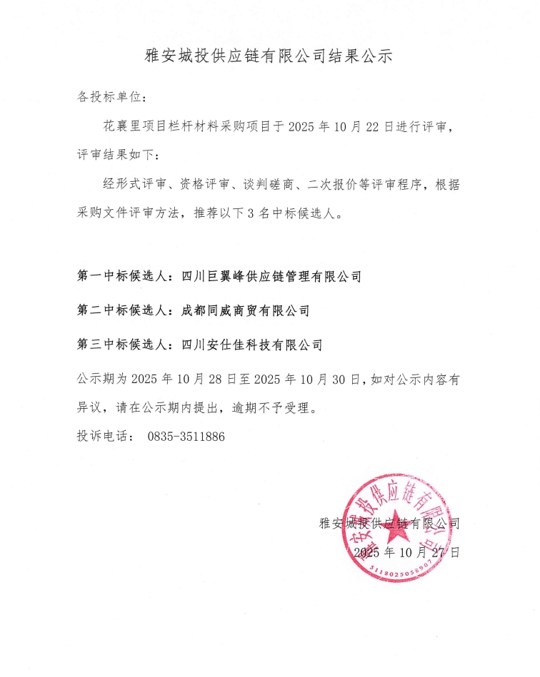 雅安城投供應(yīng)鏈有限公司花襄里項(xiàng)目欄桿材料采購結(jié)果公示