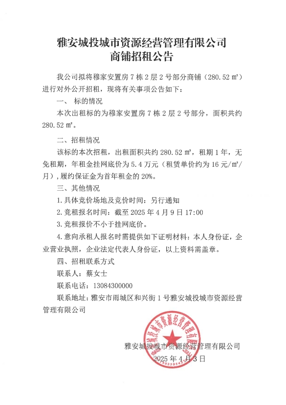 雅安城投城市資源經(jīng)營(yíng)管理有限公司商鋪招租公告