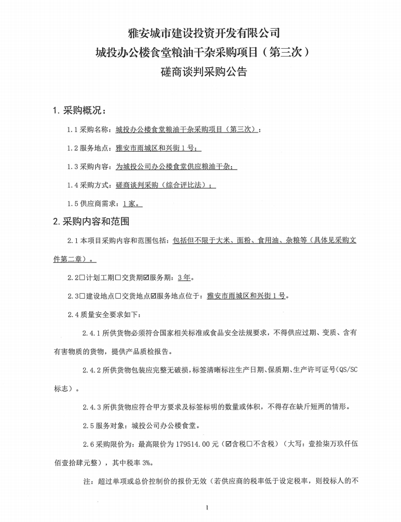 雅安城市建設(shè)投資開發(fā)有限公司城投辦公樓食堂糧油干雜采購(gòu)項(xiàng)目(第三次)磋商談判采購(gòu)公告