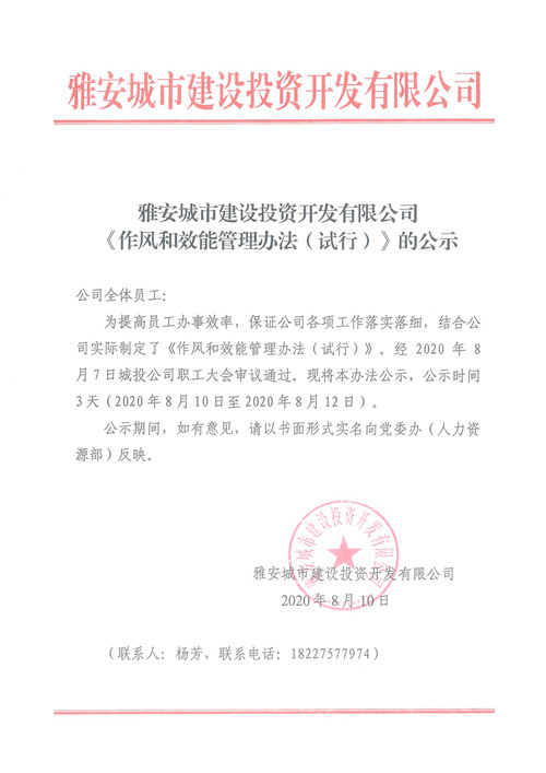 雅安城市建設(shè)投資開發(fā)有限公司《作風和效能管理辦法(試行)》的公示