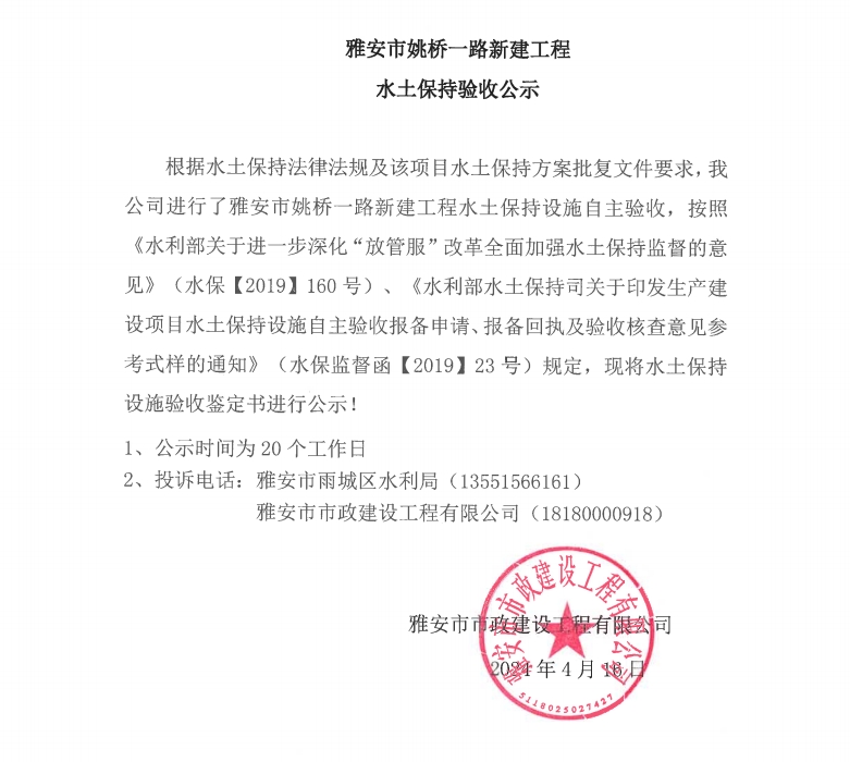 雅安市姚橋一路新建工程水土保持驗收公示