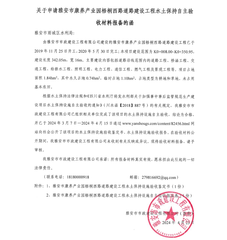 關(guān)于申請雅安市康養(yǎng)產(chǎn)業(yè)園梧桐西路道路建設(shè)工程水土保持自主驗(yàn)收材料報(bào)備的函