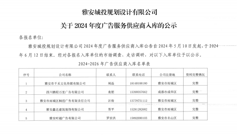 雅安城投規(guī)劃設(shè)計(jì)有限公司關(guān)于2024年度廣告服務(wù)供應(yīng)商入庫的公示
