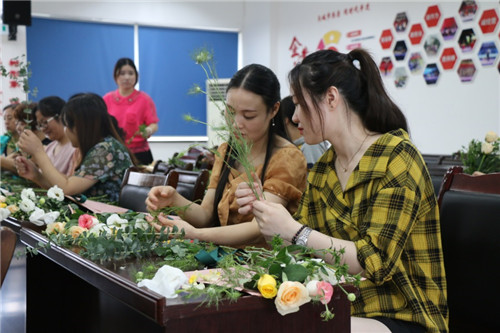 員工們緊盯花藝師邊學(xué)邊練,花枝高低錯(cuò)落、疏密有致、虛實(shí)結(jié)合……,現(xiàn)場(chǎng)氣氛非;钴S,一個(gè)個(gè)插花技巧華麗集合。經(jīng)過(guò)2小時(shí)的精心制作,一束束鮮花逐漸形成,大家看著自己的作品,充滿了成就感和喜悅感。