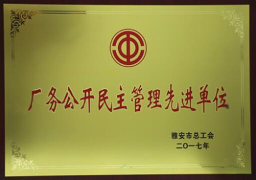 2017年7月 我公司被評(píng)為“全市廠務(wù)公開(kāi)民主管理先進(jìn)單位”